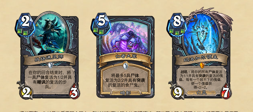 由此看来尸体是我们死亡骑士这个职业非常重要的资源,因为很多卡牌里面都会用到这个资源。并且每次友方随从死亡都可以获得一具尸体,这就意味着我们极有可能到时候使用的是一种无限杀死自己的随从,又利用自己死掉的随从来增加自己战斗力的一种循环。