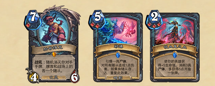 除此之外已经曝光的卡牌中还有传说随从帕奇维克、稀有法术吸血鬼之血、普通随从骷髅帮手等等。这些卡牌光是从你牌面的介绍来看都比较具有趣味性,尤其是吸血鬼之血,同样是消耗尸体获得生命并且多抽一张牌,这种机制很容易让我们想到DKT的灵打,毕竟DKT最出名的就是自己的回血,这张卡牌也同样起到了非常强悍的回血效果。