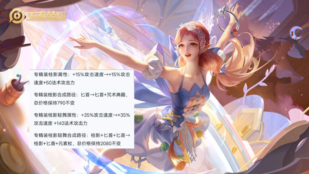 最后便是艾琳了,不过调整的是艾琳的专精装。作为最早一批出专精装的英雄,目前来看艾琳的专精装确实有点落伍了。专精装的基础属性只有攻速加成,这就导致艾琳如果先出专精装的话,前中期伤害明显不足。这次调整给艾琳的专精装加上了法术攻击力,并且价格不变,提高了出专精装的伤害,还是非常不错的。