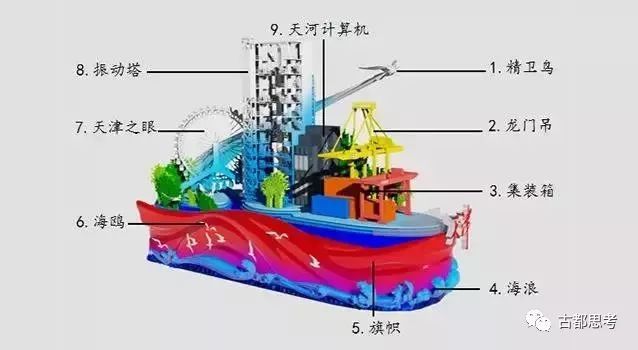 彩车上集中了天津港、天河计算机、火箭全箭模态试验振动塔、天津之眼等标志性建筑与高科技产业符号,龙门吊、集装箱元素是北方国际航运核心区的象征;全箭模态试验振动塔、天河计算机是天津智能制造尖端水平的代表。
