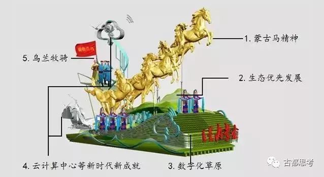 彩车上奔腾的蒙古马形象,展现“弘扬蒙古马精神”,以绿色展现“生态优先、绿色发展”的理念,以乌兰牧骑人车互动展现传承发展“乌兰牧骑精神”。同时,统筹考虑草原文化元素的均衡性和独特性,充分彰显浓郁的民族与地域文化特色。彩车顶部是代表着当今内蒙古“云计算中心”的“数字云”符号,体现了新时代的新成就。彩车下方元素来自于工业与农牧产品加工业的自动化生产线元素与风能、光伏能源的元素展现。