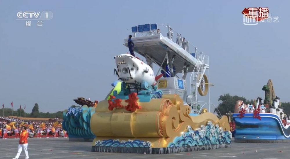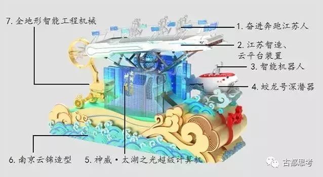 彩车中层展现蛟龙号深潜器、神威太湖之光超级计算机、徐工全地形智能工程机械等江苏标识性元素,再现了江苏国内领先的科技实力和发达的制造业。