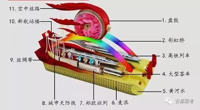 元素二:中欧班列一蓉欧快铁、新能源页岩气开发、核电技术华龙一号、电子信息墙。表达党的十八大以来具有四川特色的支柱产业和现代高科技发展,反映四川“一带一路”建设新成果和四川经济发展、科技进步、军民融合的辉煌成就。