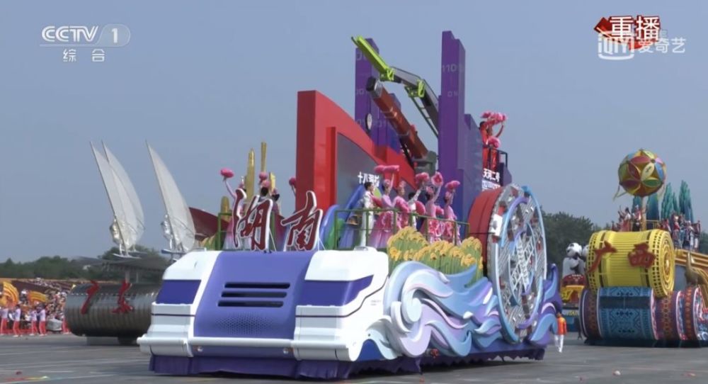 湖南彩车选择最能代表湖南风貌的地理标识开始,比如一湖四水。同时,选择张家界作为湖南山川的代表性符号,由水和山组成湖南的秀美和俊朗,并以此展现湖南良好的自然生态,体现总书记所说的‘绿水青山就是金山银山’的重要理念。湖南彩车是唯一采用工程机械底盘的彩车,在新技术、新材料、安全、环保、节能等方面有较多创新,充分体现了湖南较高的工业制造技术水平。