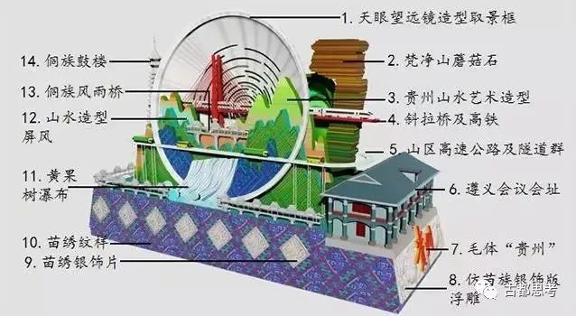 同时,在艺术化山水间,穿插桥梁高铁、公路隧道群,体现贵州建设的巨大发展。底座部分,以贵州苗绣银饰装饰,体现贵州多民族团结特色风貌。以遵义会议模型为车首,体现贵州永远发扬遵义会议精神,贵州发展始终坚持党的引领。