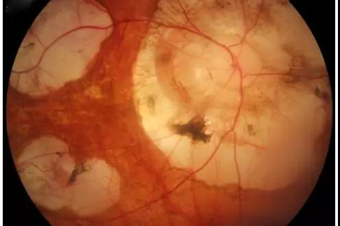 图1:病理性近视造成的黄斑病变、视网膜脉络膜萎缩等眼底损害