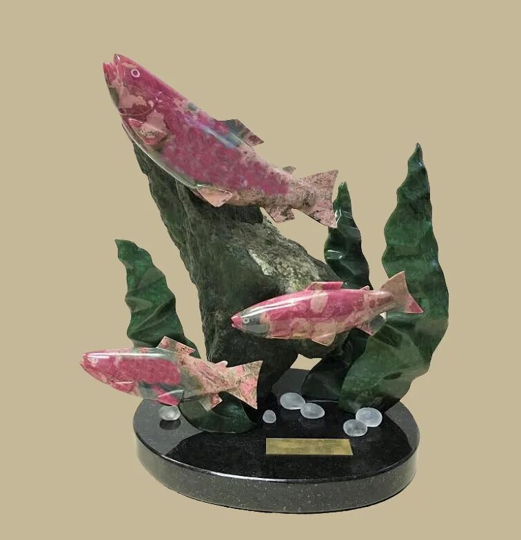 另外,我们说在玉雕作品中最能体现出自然与人类构思巧妙结合的就是俏色巧雕。在胡昌民先生的作品中就可以充分体现出这一点,比如他把殷红色品种的三文鱼用加拿大北部出产的蔷薇辉石来表现,并与BC玉结合起来进行创作,同时把水晶石和玛瑙石作为点缀,使作品在色彩的运用和造型上具有独创性和观赏性,同时又具有浓郁的温哥华地域特色。总之,在胡昌民的作品中充分体现出了中国传统文化“天人合一”的特点。