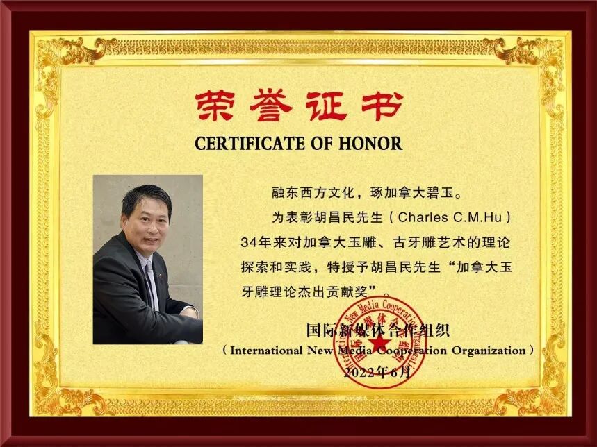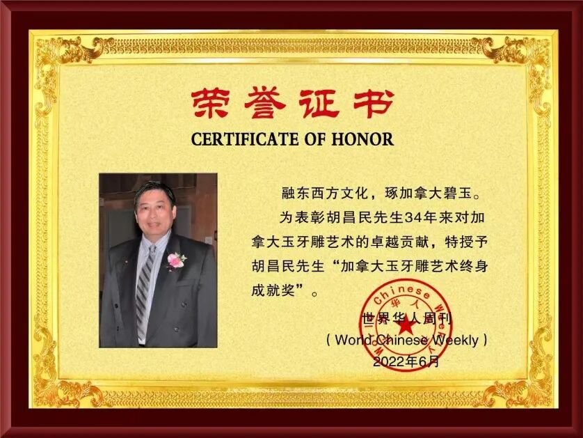 对于世界华人周刊颁发给本人的“加拿大玉牙雕艺术终身成就奖” 和国际新媒体合作组织颁发的“加拿大玉牙雕理论杰出贡献奖” 我谨表示由衷感谢!