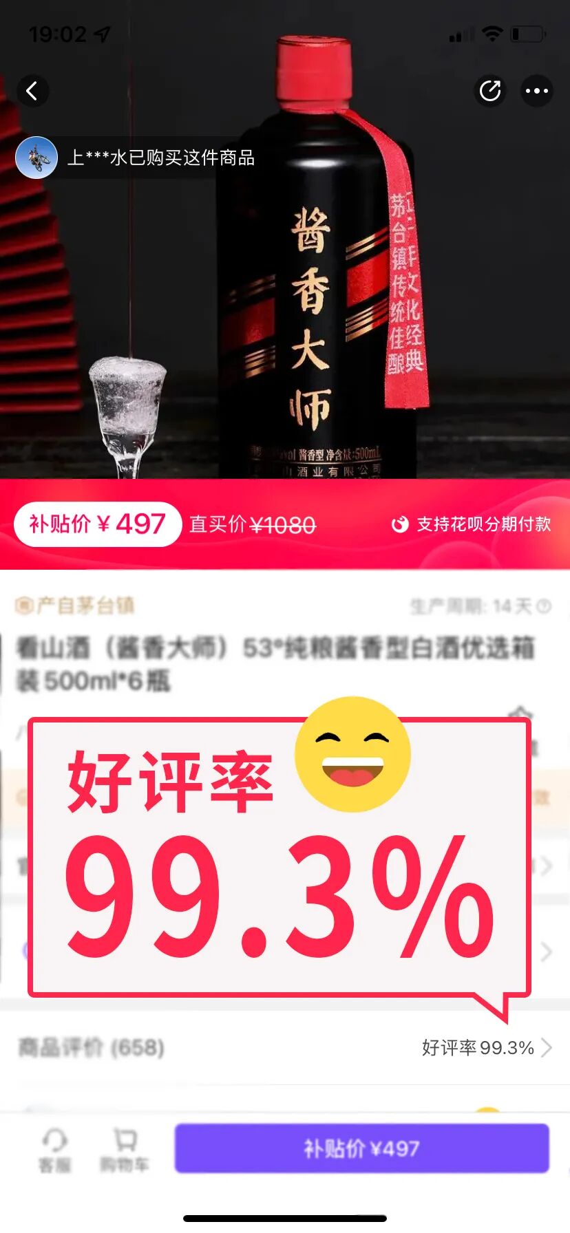 即日起至22日,原价1080元/箱(6瓶)的看山酱香大师,限时补贴仅需497元/箱!下单立减583元,比5折还便宜!!!一顿火锅的价钱,换一瓶纯粮酿造的国标优级酱酒,想想就觉得巨划算!?520送老公、送男友,小酌怡情,轻松惬意!?父亲节买给老父亲当口粮酒,天天喝不心疼!?端午节囤着请客招待,凸显品味,有面子!?年节送领导、送长辈,上档次又不超预算!