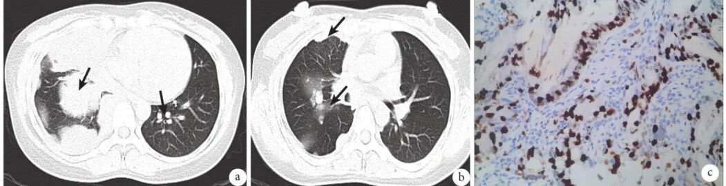 a:该结节(箭头)长4.61 cm×4.81 cm,有明显的分叶、毛刺和血管集束征,CTR>50%,伴有多发胸膜转移,组织病理学证实为IAC,Ⅳ期;b:Ki-67表达50%(×200);CTR:实性成分比例;IAC:浸润性腺癌