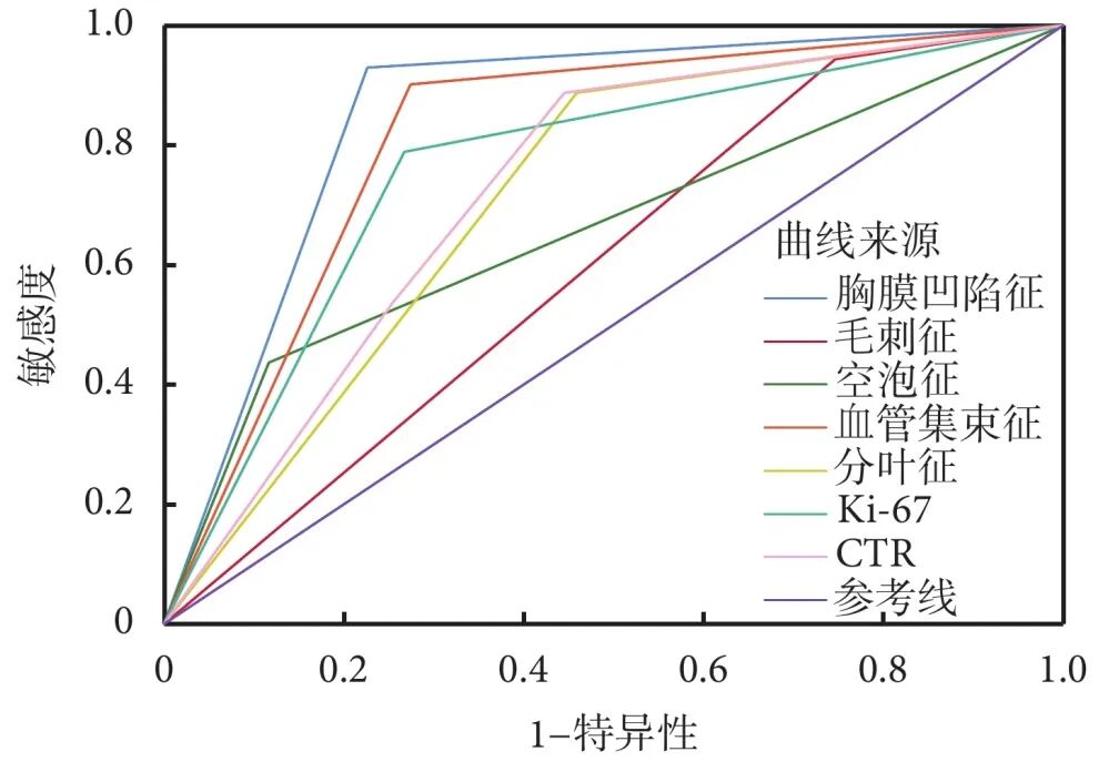 肺部影像学特征与Ki-67的表达程度预测肺腺癌浸润程度的ROC曲线分析显示,Ki-67曲线下面积(area under the curve,AUC)为0.761,敏感度和特异性分别为78.9%和73.3%;CTR的AUC为0.728,敏感度88.7%,但特异性仅为55.5%;血管集束征和胸膜凹陷征的AUC分别为0.814和0.852,血管集束征的敏感度和特异性分别为90.1%、72.6%,胸膜凹陷征的敏感度和特异性分别为93.0%、77.4%;毛刺征的AUC为0.599,敏感度和特异性分别为94.4%和25.3%;空泡征的AUC为0.660,敏感度和特异性分别为43.7%和88.4%;见表5。