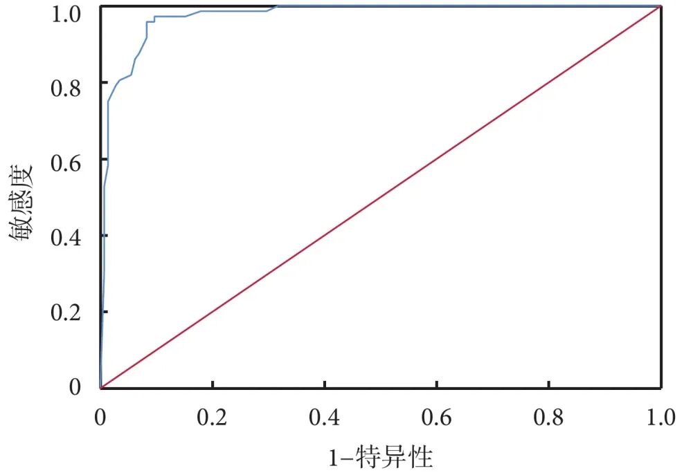 将联合指标通过二元logistic回归得出预测概率,再计算出ROC曲线,可以通过ROC曲线结果得出联合指标AUC=0.975,95%CI(0.957,0.993),其敏感度为97.2%,特异性为90.3%,均>90%,P=0.000;见图2。提示联合指标预测肺腺癌浸润程度具有较高的预测价值。