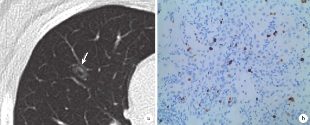 a:该结节(箭头)长1.0 cm×0.8 cm,有空泡征、分叶状、毛刺、血管集束征,CTR<25%,组织病理学证实为MIA,ⅠA1期;b:Ki-67表达3%(×200);CTR:实性成分比例;MIA:微浸润腺癌