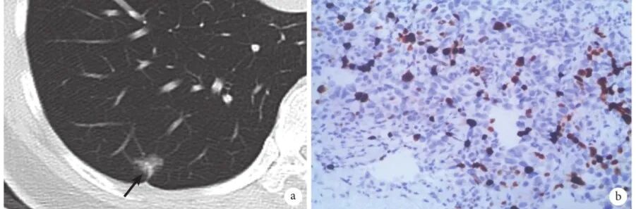 a:结节(箭头)长1.3 cm×0.8 cm,有分叶、毛刺、胸膜凹陷和血管集束征,CTR<50%,组织病理学证实为IAC,ⅠA2期;b:Ki-67表达10%(×200);CTR:实性成分比例;IAC:浸润性腺癌