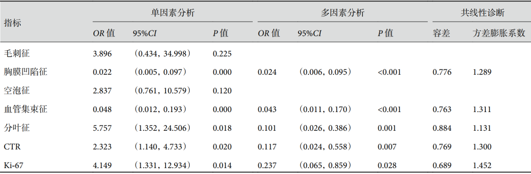 根据logistic单因素回归分析结果,毛刺征(P=0.225)与空泡征(P=0.120)预测效能没有统计学意义(P>0.05),可能是由于肺结节在生长过程中向外牵拉有时与炎症难以鉴别,同时也会受主观因素的影响。其余影像特征及Ki-67预测效能均具有统计学意义(P<0.05)。将有统计学意义的结果再进行多因素分析,差异仍然有统计学意义。将胸膜凹陷征、血管集束征、分叶征、CTR及Ki-67(将以上指标称为联合指标)进行多重共线性分析,结果显示自变量之间不存在线性相关关系,具有预测意义;见表6。