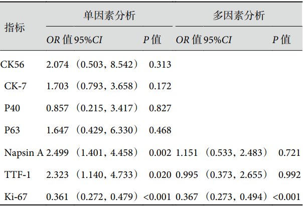 单因素分析显示,两组患者在免疫组织化学指标CK-7、P63、P40和CK56表达方面差异无统计学意义(P>0.05),而TTF-1、Napsin A和Ki-67差异有统计学意义(P<0.05)。多因素分析显示,两组患者Ki-67差异仍有统计学意义(P<0.001),提示Ki-67和肺腺癌浸润程度高度相关;见表2。