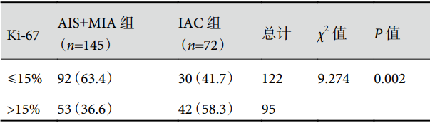 根据ROC曲线,计算约登指数,得出Ki-67的最佳临界值为15%;见图1。Ki-67≤15%的患者在AIS+MIA组有92例(63.4%),在IAC组有30例(41.7%);Ki-67>15%的患者在AIS+MIA组有53例(36.6%),在IAC组有42例(58.3%),经χ2检验,差异有统计学意义(P=0.002)。结果提示,肺腺癌的浸润程度越深,患者的Ki-67表达程度越高;见表3。