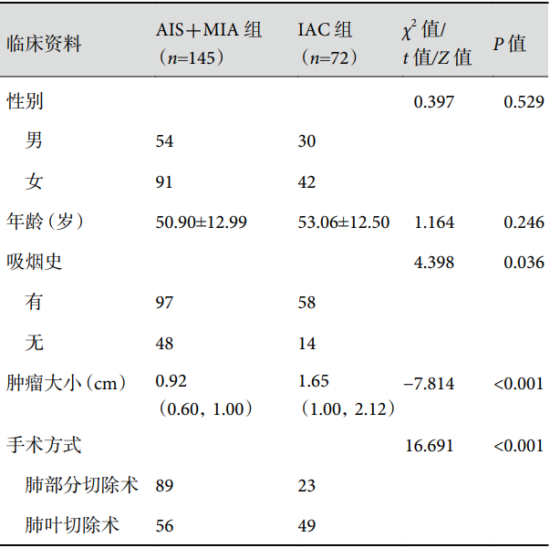 回顾性分析2017年 9月—2021 年 8月厦门大学附属第一医院经肺癌多学科综合诊疗门诊判断为可疑肺癌且术后证实为肺腺癌的217例肺结节手术患者的临床资料,其中男84例、女133例,年龄52(25~84)岁。所有患者术前常规行胸腹部CT 检查、全身骨显像和颅脑CT,以明确病变位置、大小、有无向外浸润及与周围器官的关系,及其它评估心肺功能的检查。纳入标准:(1)年龄 18~85岁;(2)影像提示可疑恶性结节;(3)胸部薄层 CT 检查、颅脑 CT、上腹部 CT/腹部超声等常规检查无转移,必要时行骨扫描、头颅磁共振、正电子发射计算机断层显像等检查未发现肿瘤明显外侵及远处转移;(4)无明显手术禁忌证。排除标准:(1)影像学资料或术中发现有转移的恶性肿瘤;(2)心肺功能无法耐受的患者;(3)患有其它恶性肿瘤病史。根据肺癌浸润程度,将患者分为两组,原位腺癌(adenocarcinoma in situ,AIS)及微浸润性腺癌(minimally invasive adenocarcinoma,MIA)组(145 例),浸润性腺癌(invasive adenocarcinoma cancer,IAC)组(72 例),两组患者临床资料见表1。