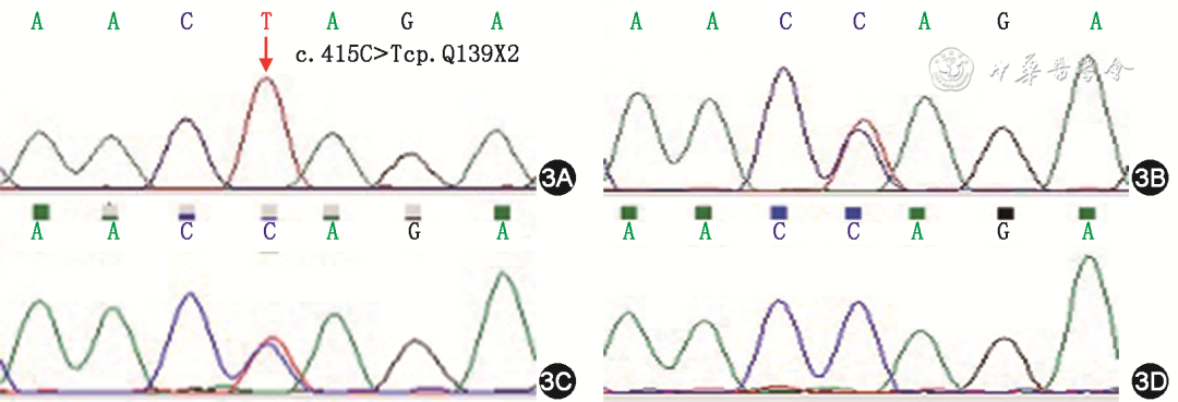 图3 先证者及其父母LDLRAP1基因测序图(3A为先证者基因纯合突变测序图,3B为先证者父亲基因杂合突变测序图,3C为先证者母亲基因杂合测序图,3D为正常对照基因测序图)