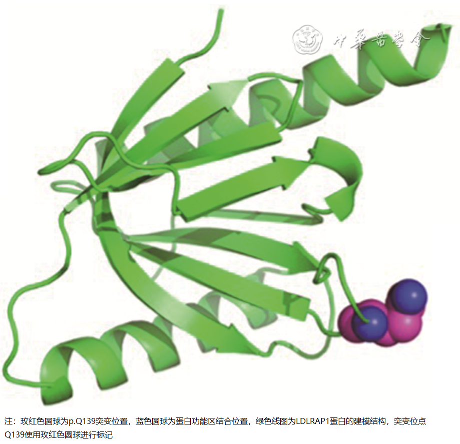 5. LDLRAP1基因Sanger测序及变异功能预测:收集先证者及其家系成员外周血,离心后分离血细胞,分别于-20 ℃保存;数据采用VarScan和GATK软件分析,包括质量评估、阅读比较、变异识别、变异注释、可视化和优先排序。使用ANNOVAR软件对变体调用格式文件进行注释,并使用这些变体的次要等位基因频率,根据ClinVar判断接合性、功能、基因内的位置和致病性。次要等位基因频率(minor allele frequency,MAF)根据1 000基因组计划、外显子组测序计划和外显子组聚合联盟数据库确定。新基因的性质突变根据美国学院建立的医学遗传学和基因组学(ACMG)指南确定[7]。筛选到的候选变异位点用Sanger测序验证(ABI3730xl测序仪,美国Applied Biosystems公司)。LDLRAP1基因突变的引物为:5'-GGTGGAGTGGGAATAGCAG-3';5'-GGTCACCTTTGGGTCCTG-3',然后对先证者家系进行基因致病突变点的验证。同时使用Uniprot Modelling对LDLRAP1蛋白进行结构建模,并使用Pymol软件对该蛋白的突变位置进行分析。