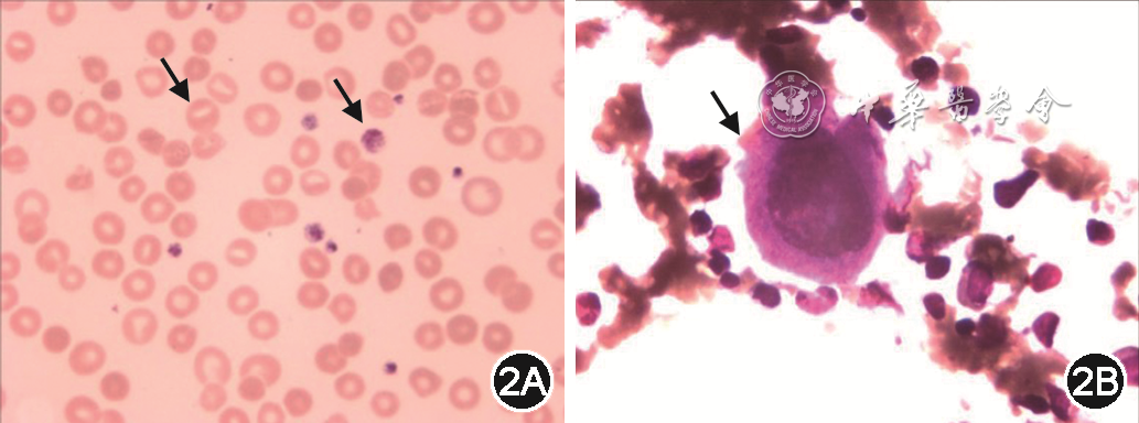 图2 先证者外周血及骨髓涂片[2A:外周血涂片,可见为异型口型红细胞(蓝箭头所示)和大血小板(红箭头所示);2B:骨髓涂片,可见形态异常的巨核细胞(箭头所示)瑞士-吉姆萨染色 ×1 000]