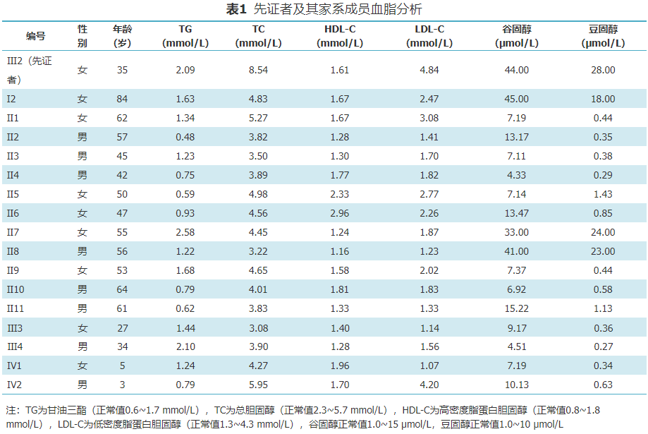 家系成员血脂分析见表1。先证者TG、TC及LDL-C血清浓度增高,豆固醇、谷固醇水平明显升高,所有家系成员LDL-C未见明显异常,Ⅱ8(先证者父亲)、Ⅱ7(先证者母亲)、Ⅰ2(先证者外祖母)豆固醇升高,分别为23、24和18 μmol/L;谷固醇升高,分别为41、33和45 μmol/L;Ⅱ5和Ⅱ6 HDL-C升高,分别为2.33和2.96 mmol/L。