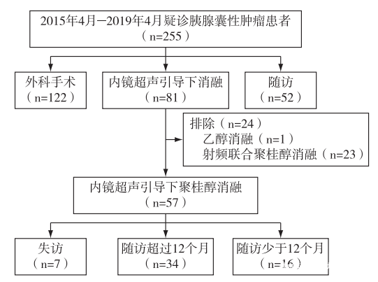 前瞻性纳入2015年4月—2019年4月解放军总医院第一医学中心255例疑诊PCNs的患者,其中女154例、男101例。排除外科手术、影像学随访及采用EUS引导下射频消融(EUS-guided radiofrequency ablation,EUS-RFA)联合或不联合聚桂醇消融者及EUS引导下乙醇消融者,最终纳入使用聚桂醇作为消融剂行EUS-LA的患者57例,如图1。本研究经解放军总医院医学伦理委员会审批通过,批号:S2014-108-01。