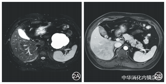 图2内镜超声引导下聚桂醇消融术后病变完全缓解2A:消融前MRI显示胰尾部71.0 mm×68.0 mm囊性肿瘤;2B:消融后4个月复查MRI,病变缩小至12.0 mm×7.0 mm