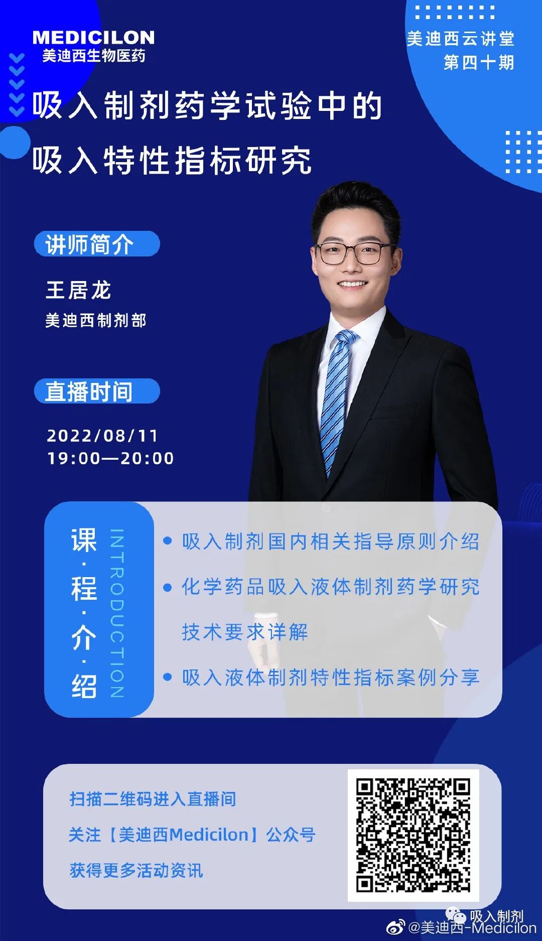 8月11日19:00,美迪西制剂部王居龙将做客云讲堂,以《吸入制剂药学试验中的吸入特性指标研究》为主题,简要介绍当下吸入制剂的国内相关指导原则,详细阐述化学药品吸入液体制剂药学研究技术要求,并结合美迪西吸入制剂研发平台的成功研发案例,深度剖析吸入液体制剂特性指标研究重点难点及破解之法,为道阻且长的吸入制剂研发之路劈荆斩棘!
