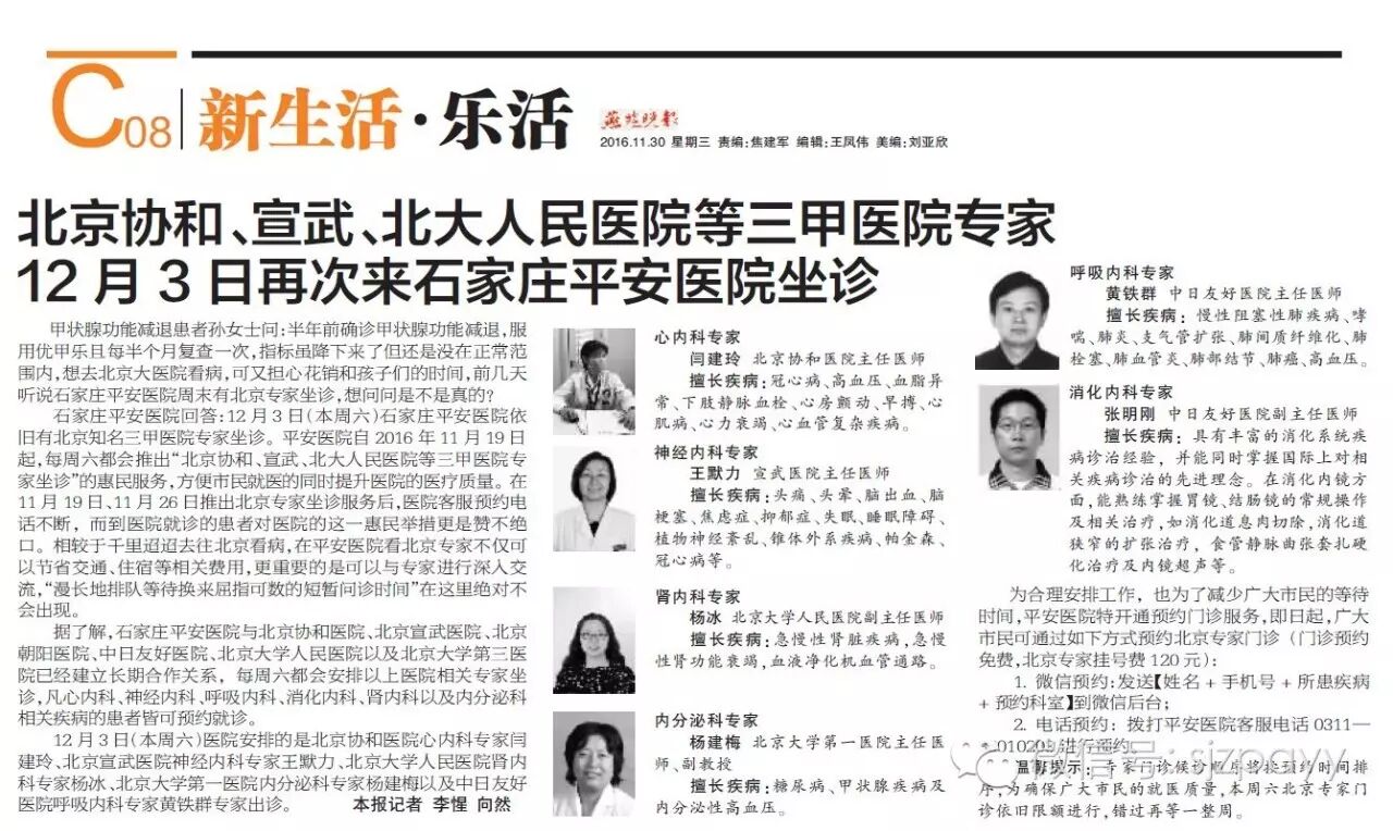 【平安 | 医疗】北京协和、宣武、北大人民医院等三甲医院专家12月3日再次来石家