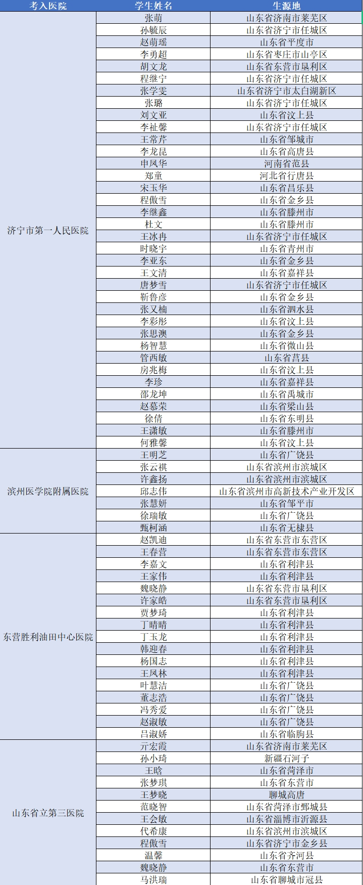 截止目前,2023届毕业生更是连续出现多名同学被同一家医院录用,如36位同学考取济宁市第一人民医院、17位同学考取东营胜利油田中心医院、12位同学考取省立三院、7位同学考取滨州医学院附属医院等等。