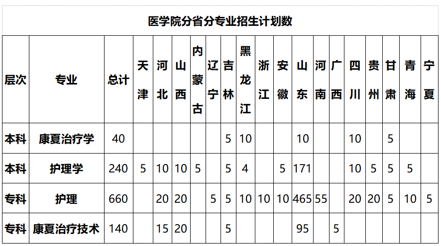 2023年医学院面向全国17个省份,共招收普通本专科1080人,各省份招生人数见下面表格。此外,专升本面向山东省共招收505人,已完成招生计划。