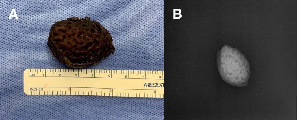图3:罪魁祸首及其大头照这是一个大小约4.0cm×3.0cm的桃核,表面横纵交错的地形地貌依然未被胃肠道里的消化液侵蚀。既然肇事者已经被捕,那就按照羁押程序让他在“锒铛入狱”前留个罪犯大头照的档案——医生们煞有介事地给桃核拍下了一张平片(图3)。术后,患者自诉浑然不知何时吞入这个桃核。尽管术后患者出现轻微的伤口血肿,但所幸的是有惊无险,桃核取出后患者的肠梗阻明显缓解,并于术后第5天出院。经验总结