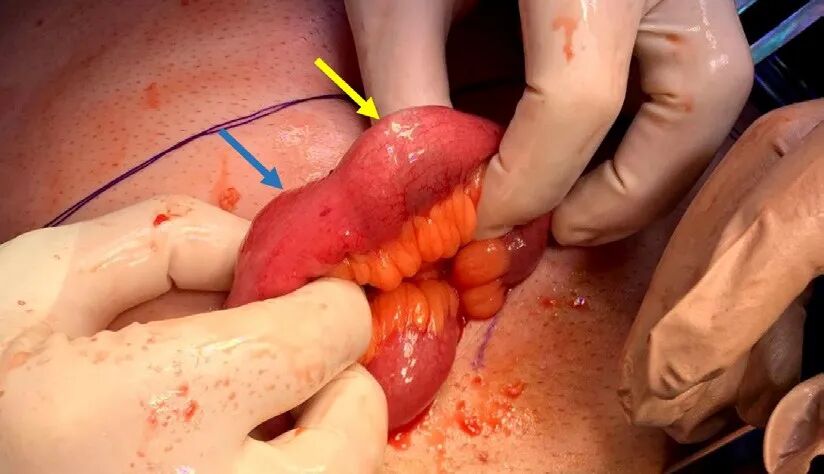 阅片后,医生心里嘀咕,这如果还看不出是小肠梗阻,那估计影像学老师的脸蛋也要气得像梗阻扩张的肠管了。环状的高密度包绕低密度中心,这个“肉夹馍”或者“恶魔之眼”一般的怪物,不就是江湖传闻的“胆石性肠梗阻”!遂叫来年轻医生们一番带教。这在肠管里“翻滚”的胆石有如小菜一碟,任你如何翻江倒海,逃不出我胸有成竹的蜜汁自信。十年磨一剑,还等什么,看我这外科圣手的剑——哦,不,是刀——柳叶刀。做好万全准备通过腹腔镜进行小肠切开取石术。如愿进入腹腔后,可见少量浆液性液体,肠管活性尚佳无坏死。然而,由于暴露受限,最终还是中转开腹。