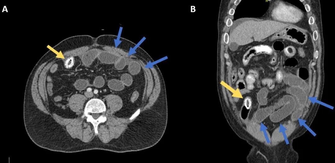 一位56岁的男性1天前开始出现间歇性左侧腹痛、恶心和呕吐,且停止排便24小时。患者之前无类似发作,也无既往史或手术史。随后医生为他进行体格检查,发现他的生命体征平稳,尽管看似“大腹便便”,但他的腹部并无压痛。触诊亦未发现任何腹部包块或腹股沟疝。肠鸣音正常。血液检查显示患者的白细胞计数升高至14×109/L,血红蛋白174g/L,血清电解质大致正常。