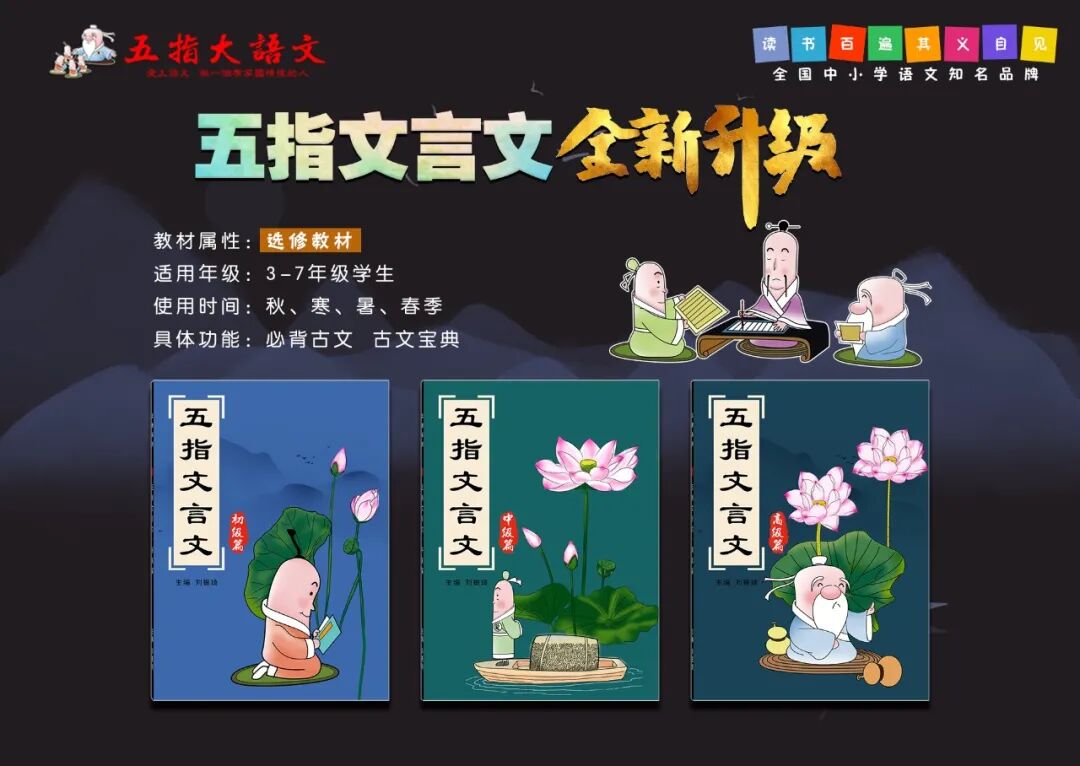 五指文言文——【传承国学 复兴中华】 五指文言文包含了丰富的天文地理、历史文化知识和治国理政的社会管理知识,也包含了道德伦理、修身养性的知识。古往今来,一代一代中华儿女,无数少年儿童从这些蒙学经典中起步,汲取知识,陶冶情操,提高修养,成人成材。【课程设置】 五指文言文,针对3—7年级学生。 【五大教学效果】 一部经典 《三字经》《百家姓》《千字文》《论语》《弟子规》《老子》《庄子》《增广贤文》等作为国学蒙学经典;一则故事中华五千年文明,留下了许多脍炙人口的经典故事。帮助学生了解中华五千年的辉煌,感受中华文化的博大精深,丰富积淀,陶冶情操; 一首歌曲 把国学文化推向舞台,让中华优秀传统文化以轻松的、欢乐的方式走进当代儿童的生活,让孩子们愉悦的玩乐过程中,学习并传承中华国学; 一份领悟 教材配图丰富新颖,力求趣味性和知识性并重。故事后或附经典原文,让读者通览经典原貌,整体感知; 一片和谐 国学蒙学经典,被认为是一项最好的亲子活动,不仅能提高孩子学习的效果,而且能增进亲情。