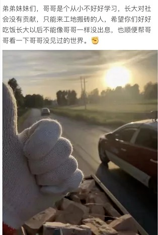 他配了一张自己在工地搬砖的照片,说道: