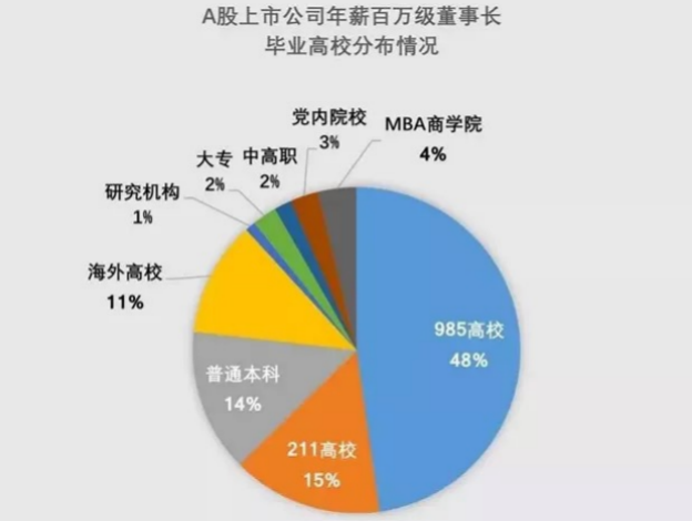 84%的高管都拥有高学历,48%毕业于985院校。