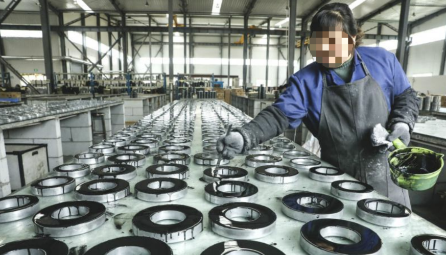 流水线上,有人负责给电机铁芯涂颜料。