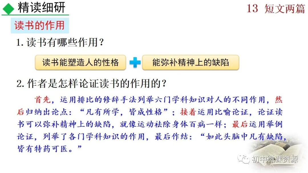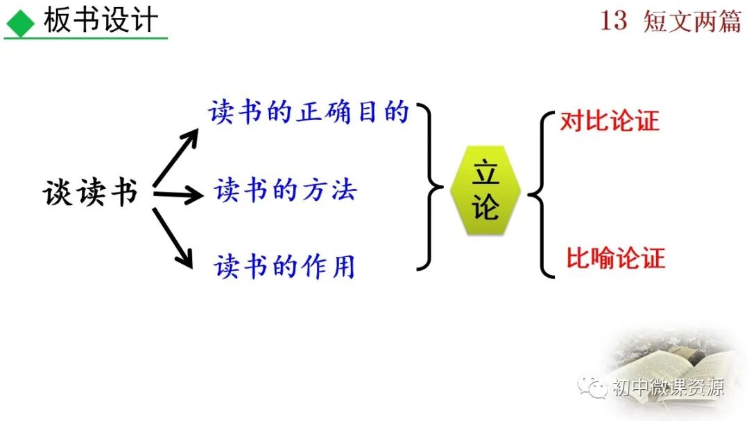 ③对比论证:开头正面说读书的目的,接着从反面说了读书的三种偏向。结尾先从正面说读书可以塑造人的性格,又从反面说读书可以弥补性格、精神上的缺陷。这样就全面有力,使人信服。