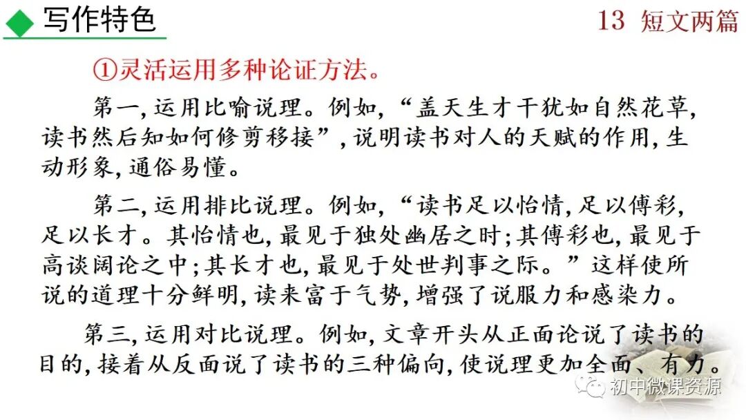 ②对比论证。例如,文章开头从正面论述了读书的目的,接着从反面论述了读书的三种偏向。正面与反面结合,使说理更加全面、有力。