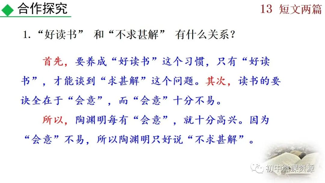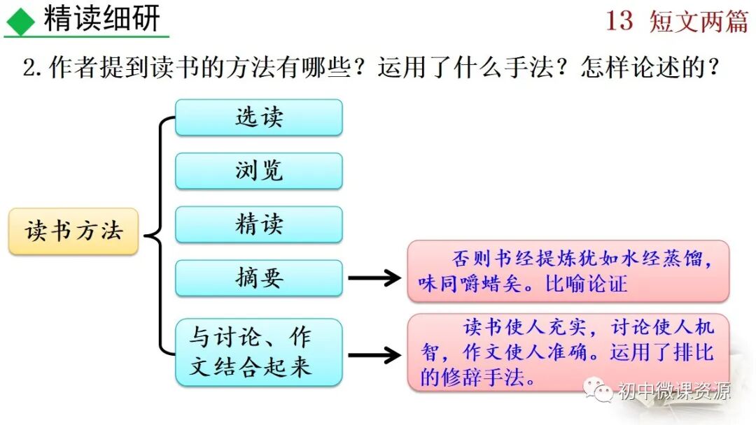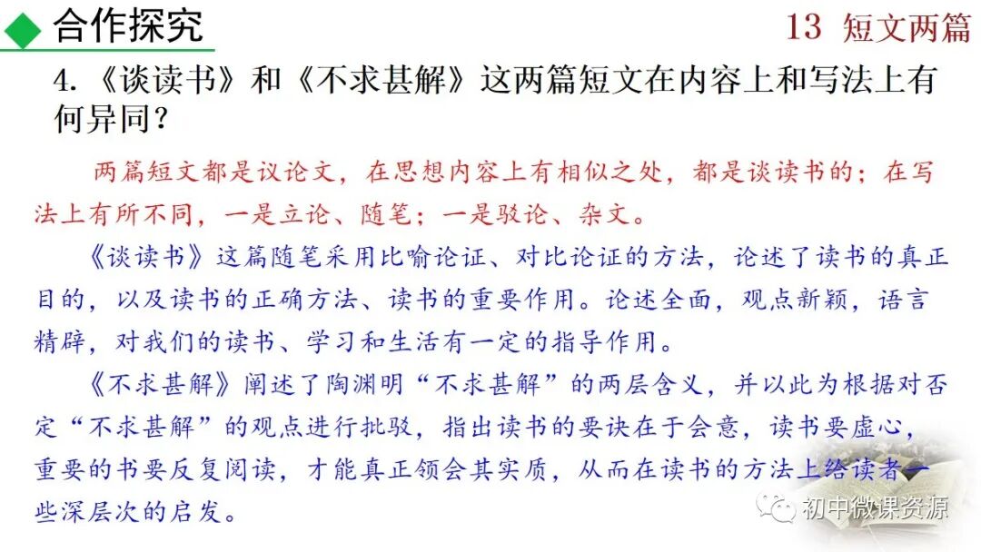 小组合作探究:《谈读书》和《不求甚解》这两篇短文在内容上和写法上有何异同?