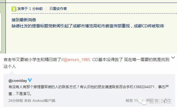 成都同人祭官方微博@ Comiday 高调发布寻人启事,希望尽快找到穿日本军装的人,并称事态严重。随后,论坛有人曝出消息称,“缺德社发的新闻引起了成都市博览局和市委宣传部重视,成都CD将被取缔”。