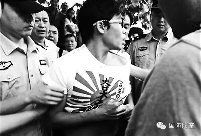 第28届泰山国际登山节,一据称来自天津的30岁左右男子,穿着印有“大日本帝国海军”的T恤登山被民众包围,有群众愤怒地将其T恤扒掉。该男子称自己在日本长大,在其他地方穿都没问题。执勤民警为防止事态恶化将其带离。