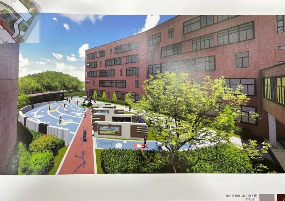 该项目拟利用学校初中教学楼北侧原有土地,扩建实验楼,建筑面积约 3700 平方米,主要建设内容为书法教室、美术教室、多功能教室、合班教室、风雨连廊等。扩建后,灵山书院初中部由 15 班扩至 29 班。工程预计2022年7月完工。
