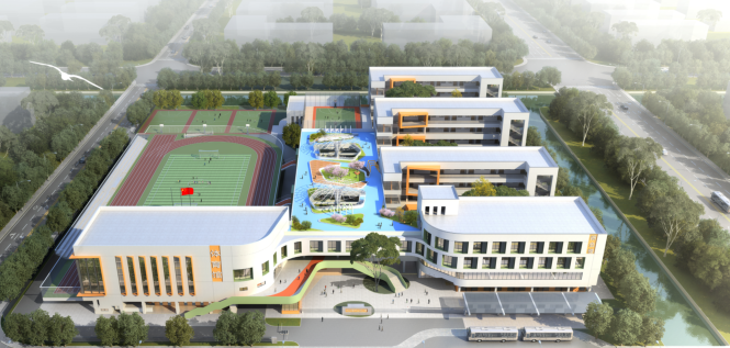 项目位于鄞州区福明街道,总建筑面积约 5.8万平方米,包括教学及教学辅助用房、办公用房、生活服务用房、地下室以及环形跑道运动场等室外体育活动设施。学校规模为 54 班。工程预计2022年9月投入使用。