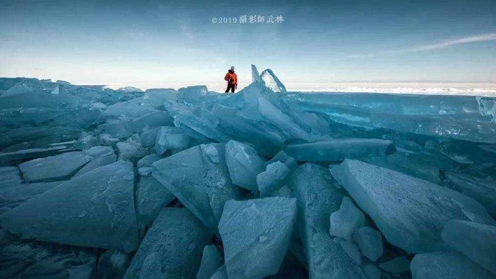 在寻找前景的时候,也需要去寻找规律,在下图我拍摄蓝冰的时候,我寻找具有整体方向性引导的蓝冰作为前景,冰块的方向都指向前方的人物。