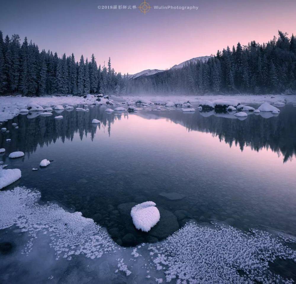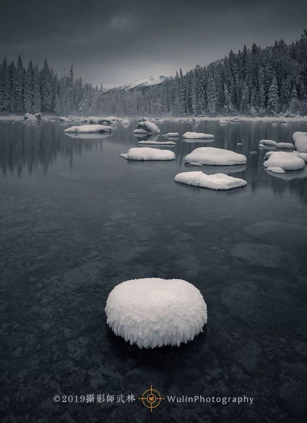以下图为例,当时我在拍摄喀纳斯湖的时候,我想选择一个尽可能简单简洁的画面,但是我又想让画面有一个让观者印象深刻的,所以我寻找一个小小的雪蘑菇,来充当画面的视觉兴趣点。