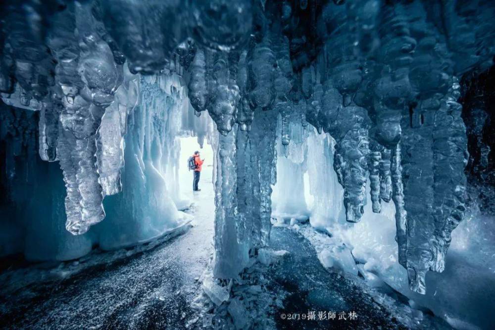 在拍摄冰洞的过程中,虽然冰洞很大,我一个人可以在其中任意行走,但是却很难有有一个直观的参照物来衬托冰洞的大小空间,所以我选择了让自己成为画面的一个点缀,站在洞口完成了这张自拍,观者可以一目了然的知晓冰洞大小。