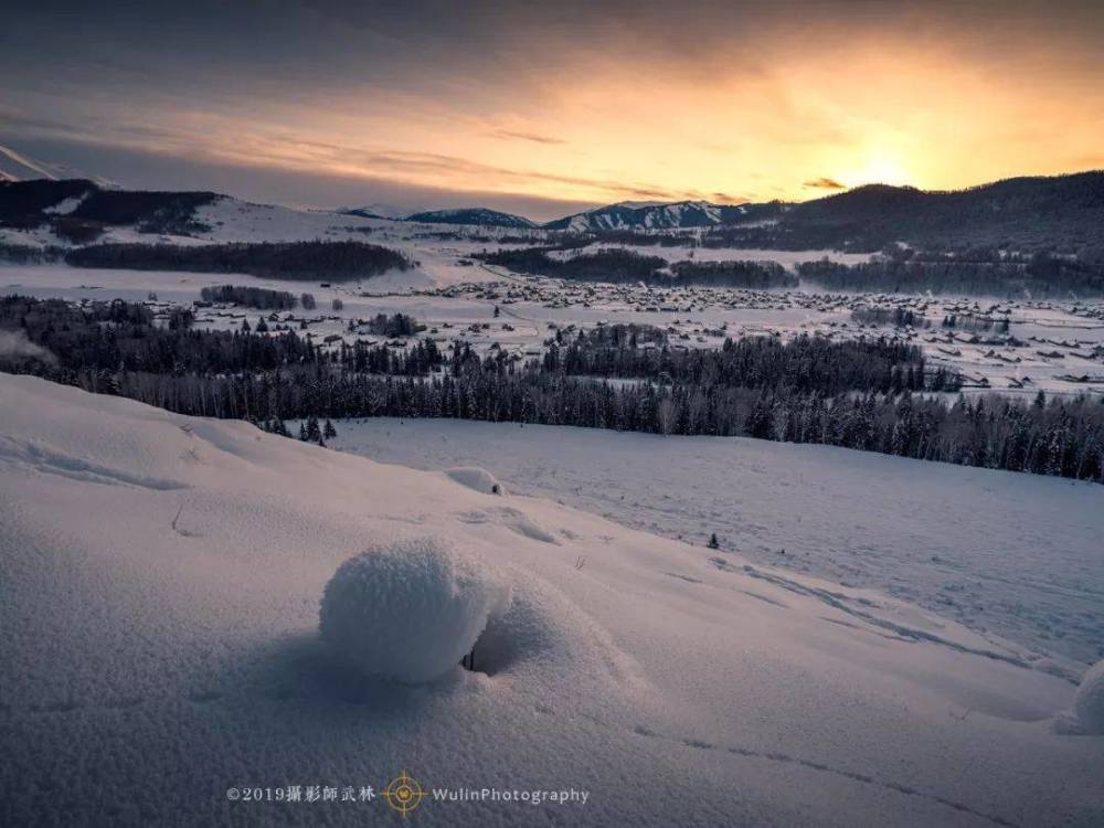 以下图为例,在禾木的观景台上,我不断的寻找可以利用的前景,发现一个可以利用的小雪蘑菇,小蘑菇虽然很小,因广角镜头的特性,配合镜头近距离拍摄,小雪蘑菇呈现出的视觉效果比实际肉眼看到的要大一些,因为有了这个小(雪蘑菇)的存在,能更好的凸显整个禾木村落深处群山环抱之中的大,正因为有了雪蘑菇的存在,近景的雪蘑菇,稍近的雪坡,中景的森林村落,远景的天空,可以很好的呈现出画面的整体纵深空间。